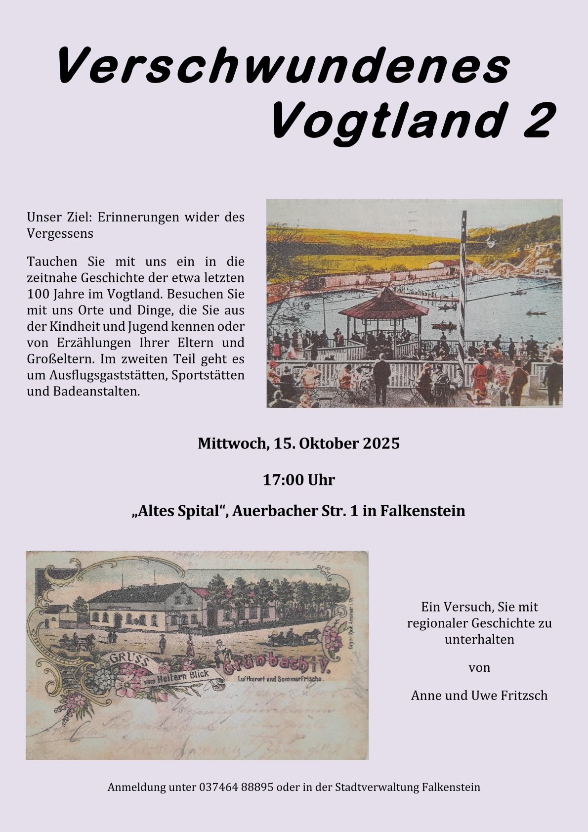 15.10.2025, 17:00 Uhr, „Verschwundenes Vogtland“ Teil 2, Vortrag mit dem Ehepaar Fritzsch aus Werda im Alten Spital